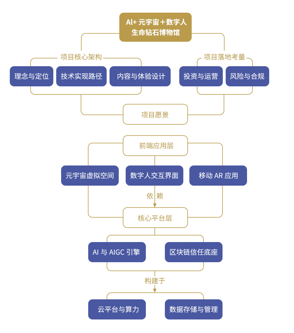 "AI+元宇宙+数字人+生命钻石博物馆"项目,构建全球首个以"生命永恒·数字永生“为主题的下一代情感传承平台。我们不仅展示生命钻石,更致力于运用前沿数字技术,封存、演绎并传承其背后独一无二的情感、记忆与文化,构建一个线上线下融合的、持续演化的“情感宇宙"。